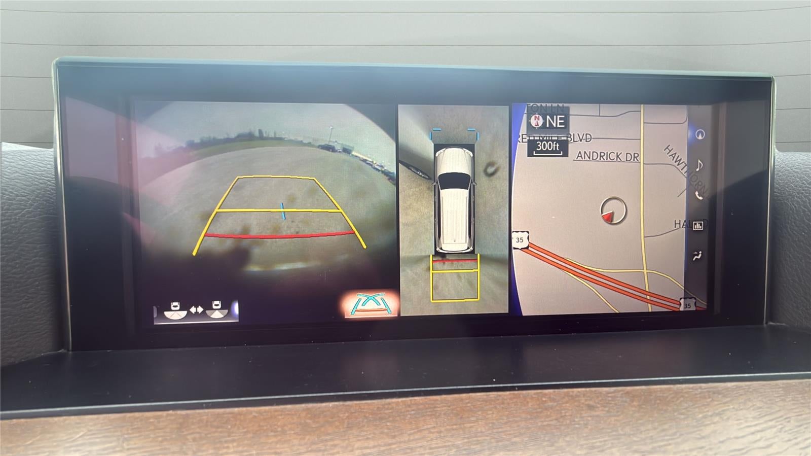 - The vehicle is equipped with a camera that displays an image of the area behind the vehicle on an interior display.
